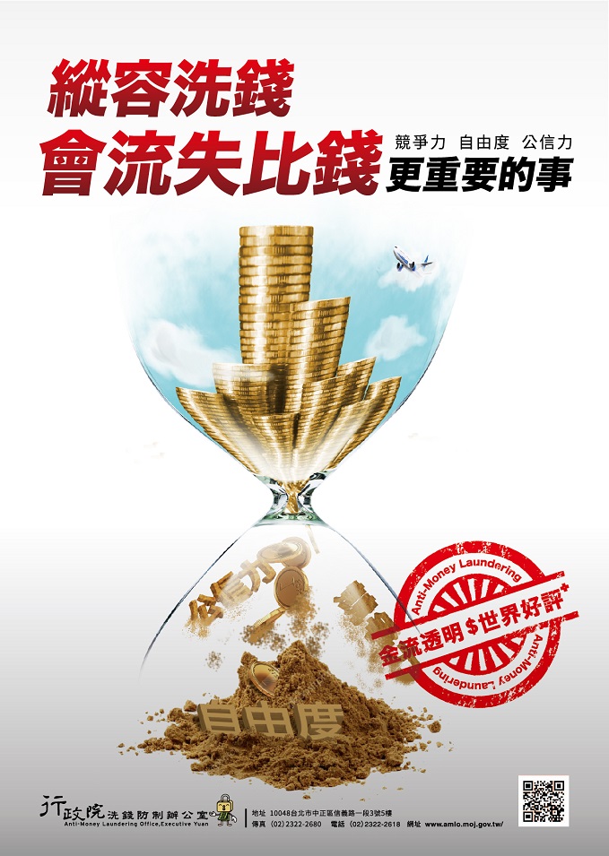 行政院洗錢防制辦公室為持續執行全國性防制洗錢宣導工作,製作旨揭「洗錢防制專業總動員」、「因應洗錢防制民眾應配合客戶審查」、「誠實申報免遭海關沒入或受罰」及「縱容洗錢會流失比錢更重要的事」等4款電子海報。